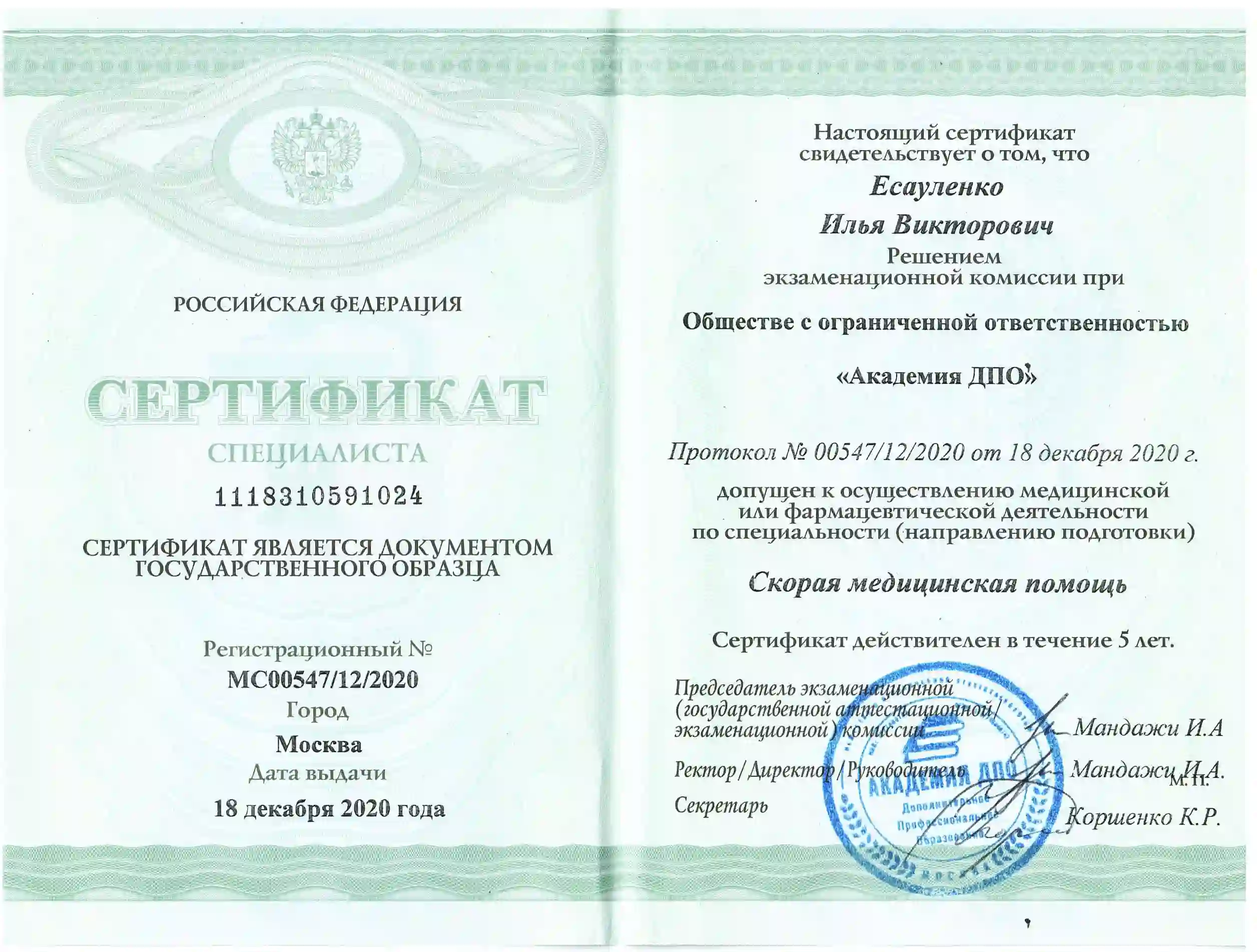Сертификат специалиста по специальности "Скорая медицинская помощь" 2020 год